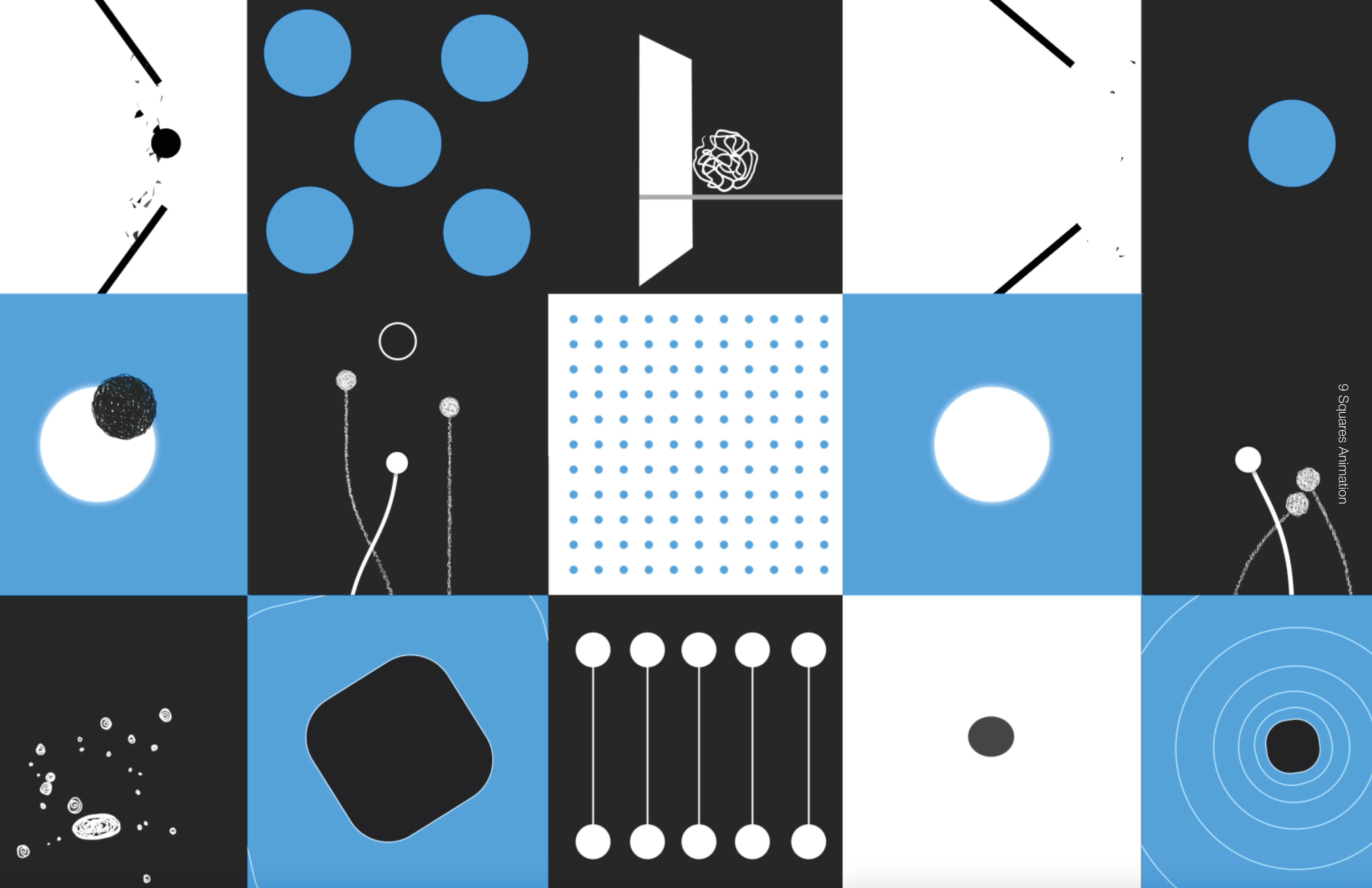 This nine squares animation explores various elements of animation, such as timing, staging, squash and stretch, and anticipation. The overall theme is analog vs digital, as the squares combine hand-drawn animation and a 2d after-effects motion.
